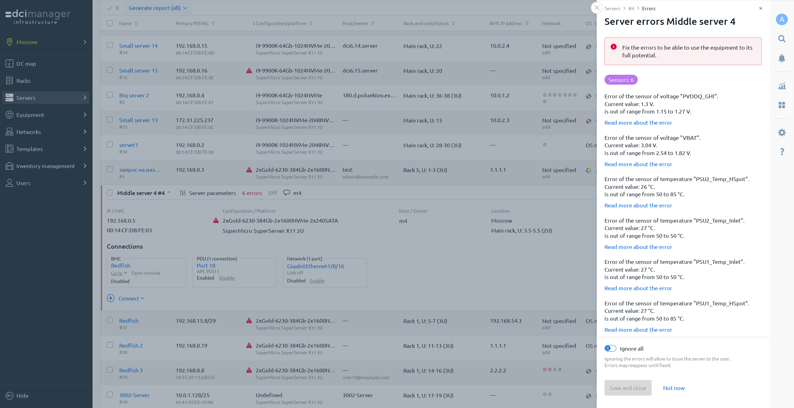 Detailed information about the diagnostic progress is available in the DCImanager interface. Upon completion of the procedure, the platform will update the equipment status data and report any errors detected.