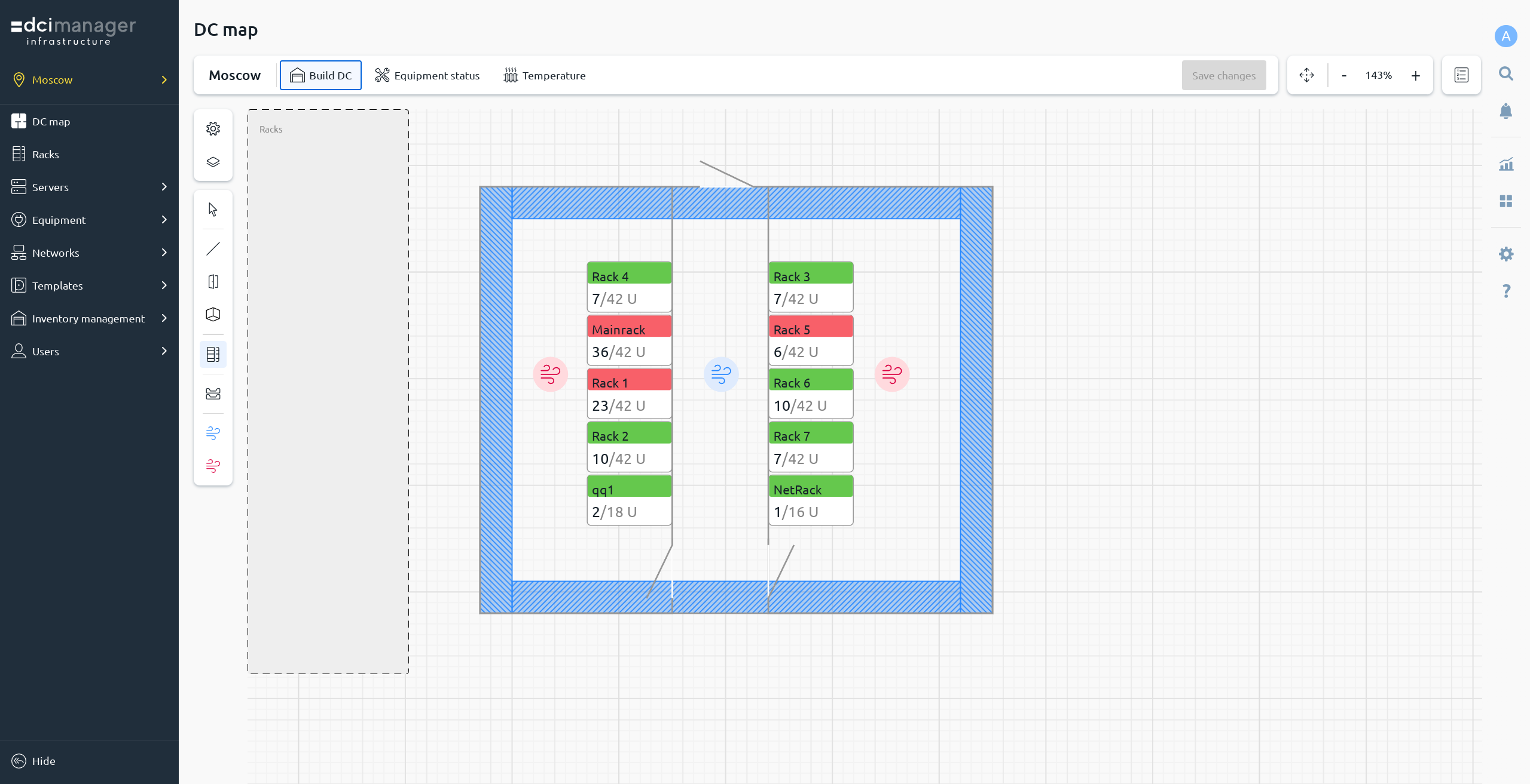 Convenient interface for managing the data center map: adding equipment and structural elements