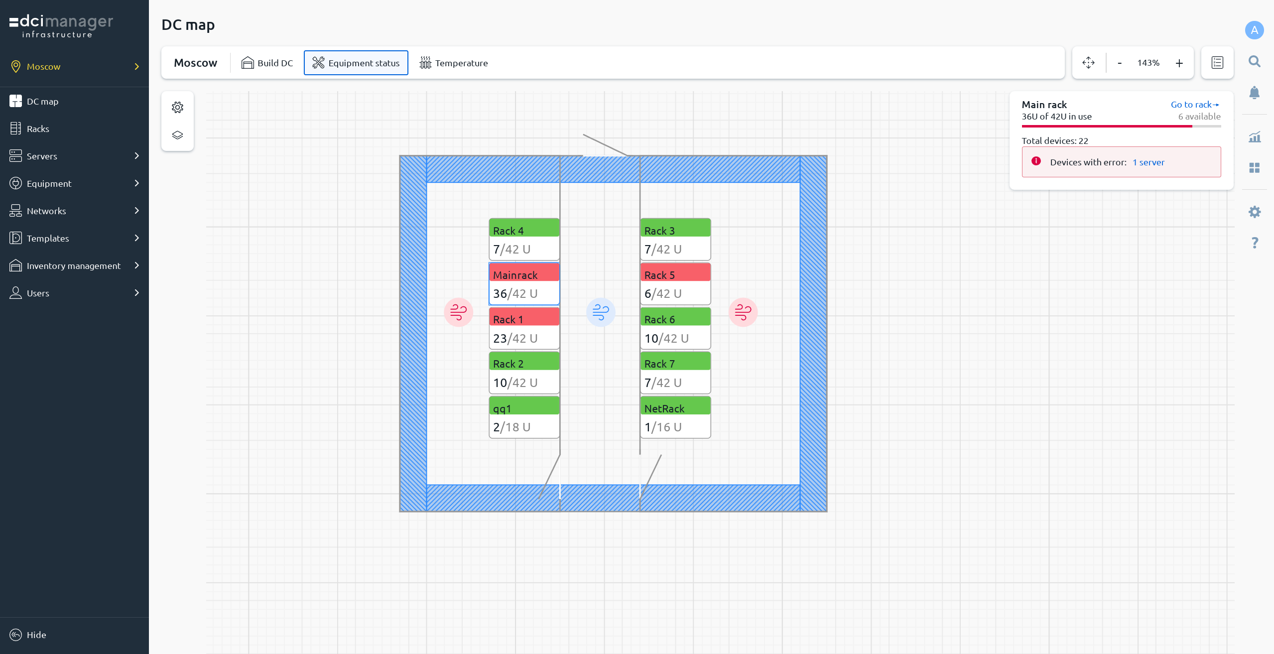 The data center map can be used to monitor the status of equipment. The map displays information about the size of the racks, the number of occupied units and possible errors in operation. Color indication allows you to quickly monitor the status of racks and UPS.