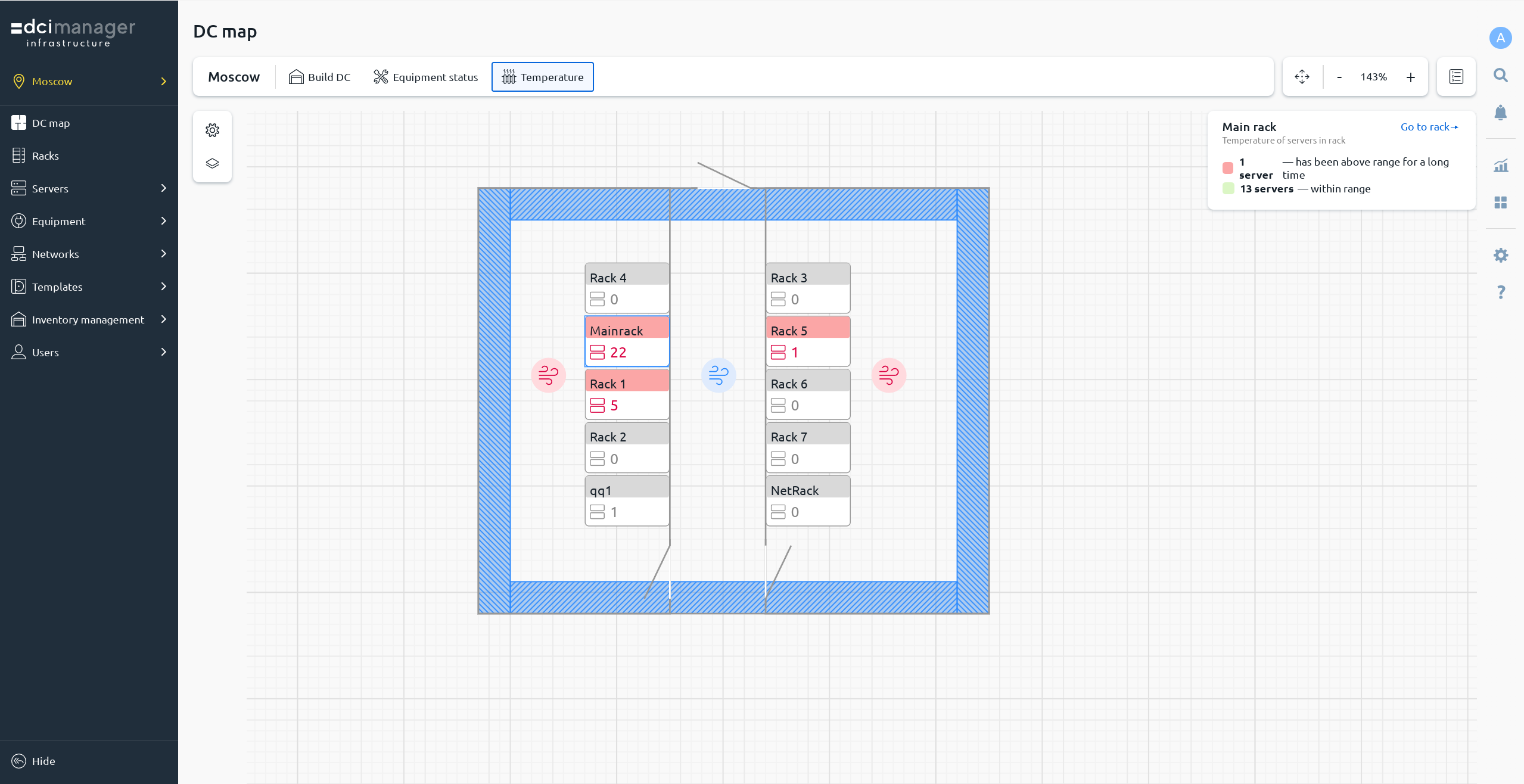 Rack temperature monitoring, color indication, data visualization on the data center map