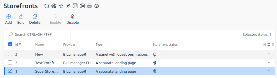 To change the status of a storefront, select the storefront and use the Enable or Disable buttons. Each provider can have only one active storefront. New storefronts are created in an inactive state.