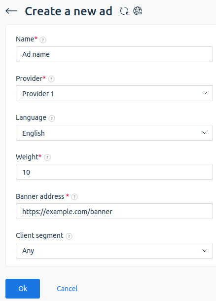 - Specify the Client segment for which this ad will be displayed. Read more about client segments in Client segments.