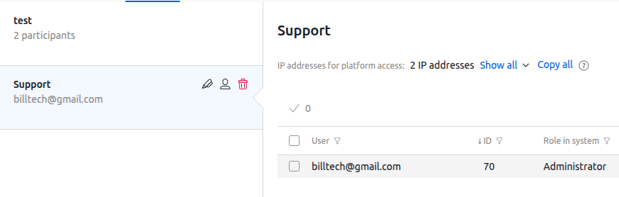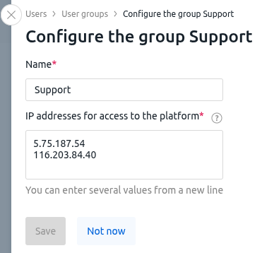 in the right-hand menu → System overview tab → enable Technical support access option. - If authorization on the platform is only available from specific IP addresses and a separate user has been created for technical support, ensure that they are permitted access from the required IP addresses (for example, 5.75.187.54 and 116.203.84.40). To do this: