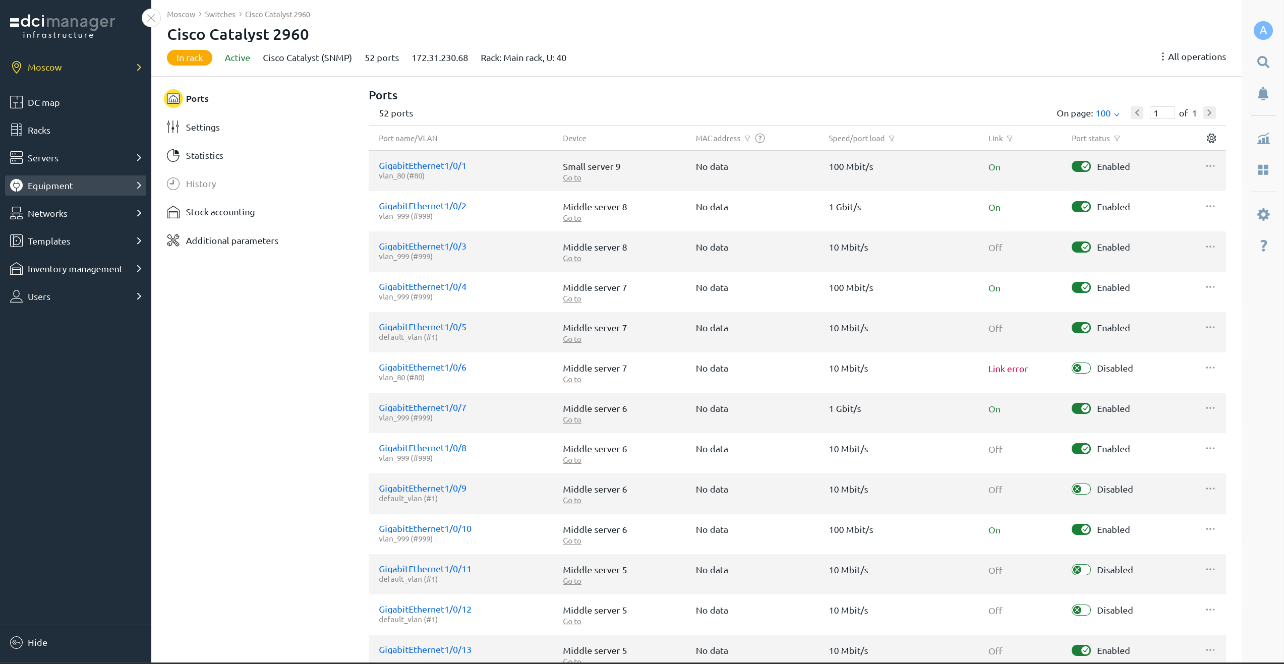 DCImanager garantiza el control del estado de la infraestructura física — equipos de servidores y redes, UPS y PDU — en todas las ubicaciones conectadas.