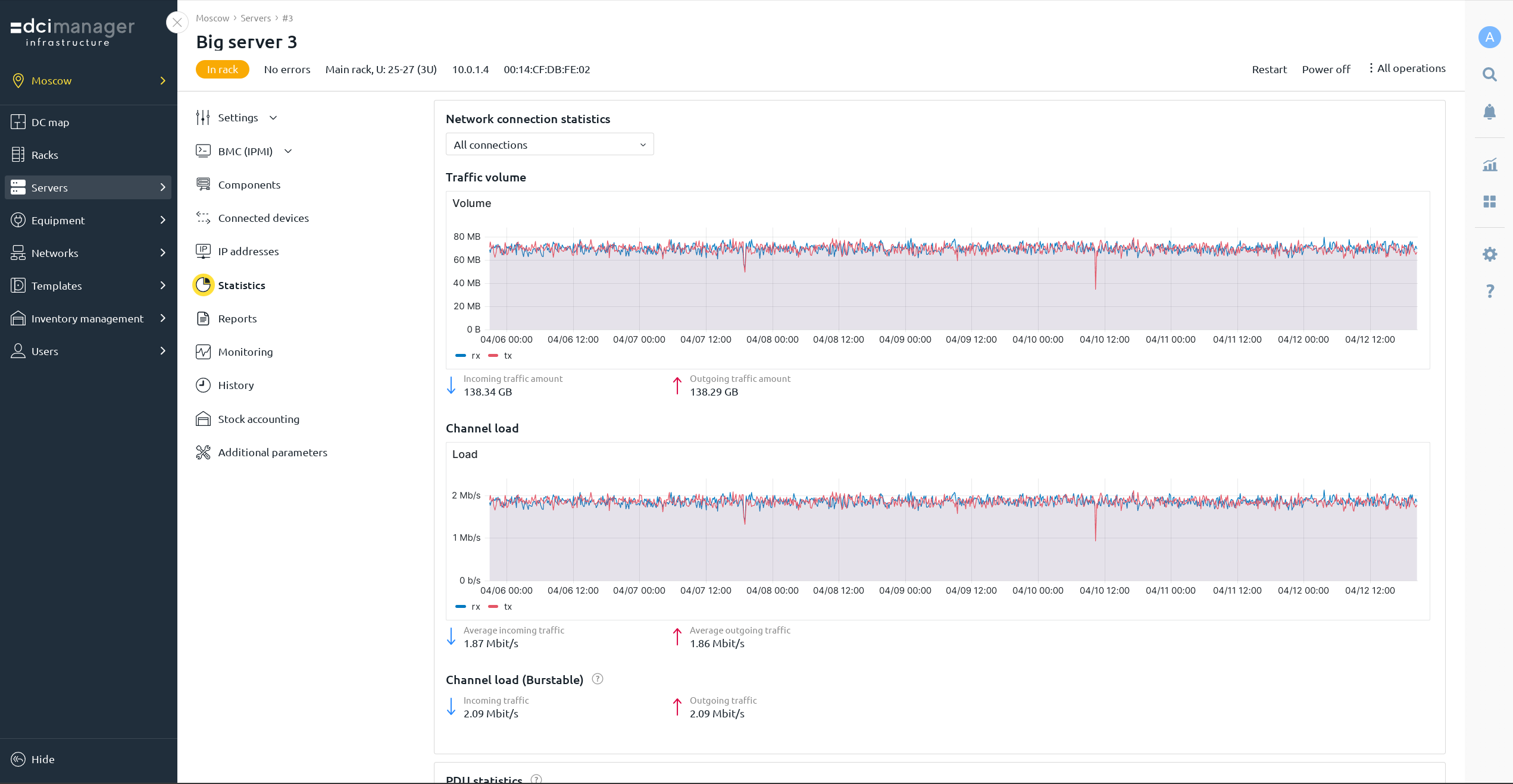 DCImanager permite monitorear la temperatura de servidores en tiempo real. El sistema recopila datos de sensores de temperatura instalados en los servidores y los muestra en la tarjeta del servidor y en el mapa del rack. La frecuencia de recopilación es desde dos minutos. El parámetro se puede configurar individualmente para cada servidor.