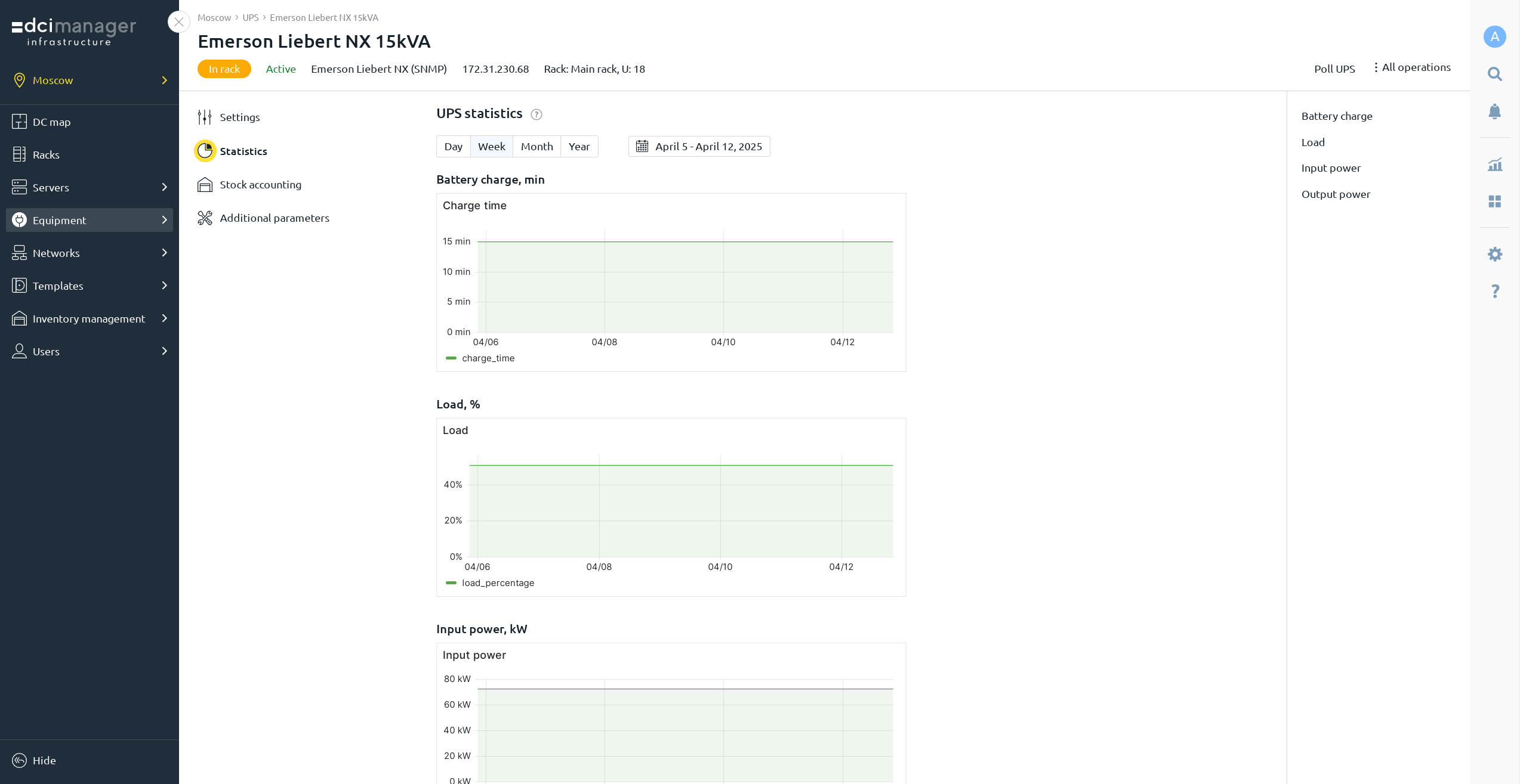 DCImanager también soporta monitoreo de fuentes de alimentación ininterrumpida (UPS) y unidades de distribución de energía (PDU). El sistema recopila datos sobre: