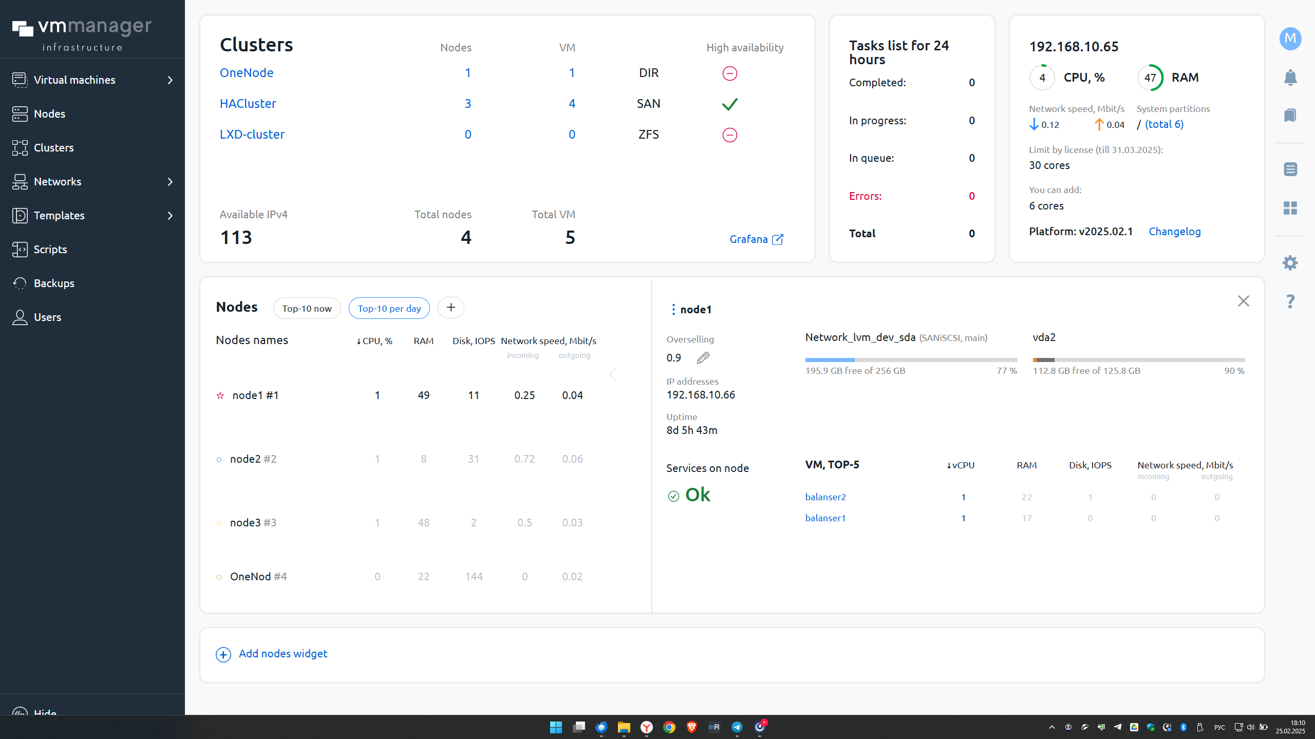 VMmanager is a convenient tool for centralized virtualization management. The platform offers tools for creating a fault-tolerant virtual environment and is suitable for managing hardware and container virtualization, isolating and abstracting virtual infrastructure from physical infrastructure.