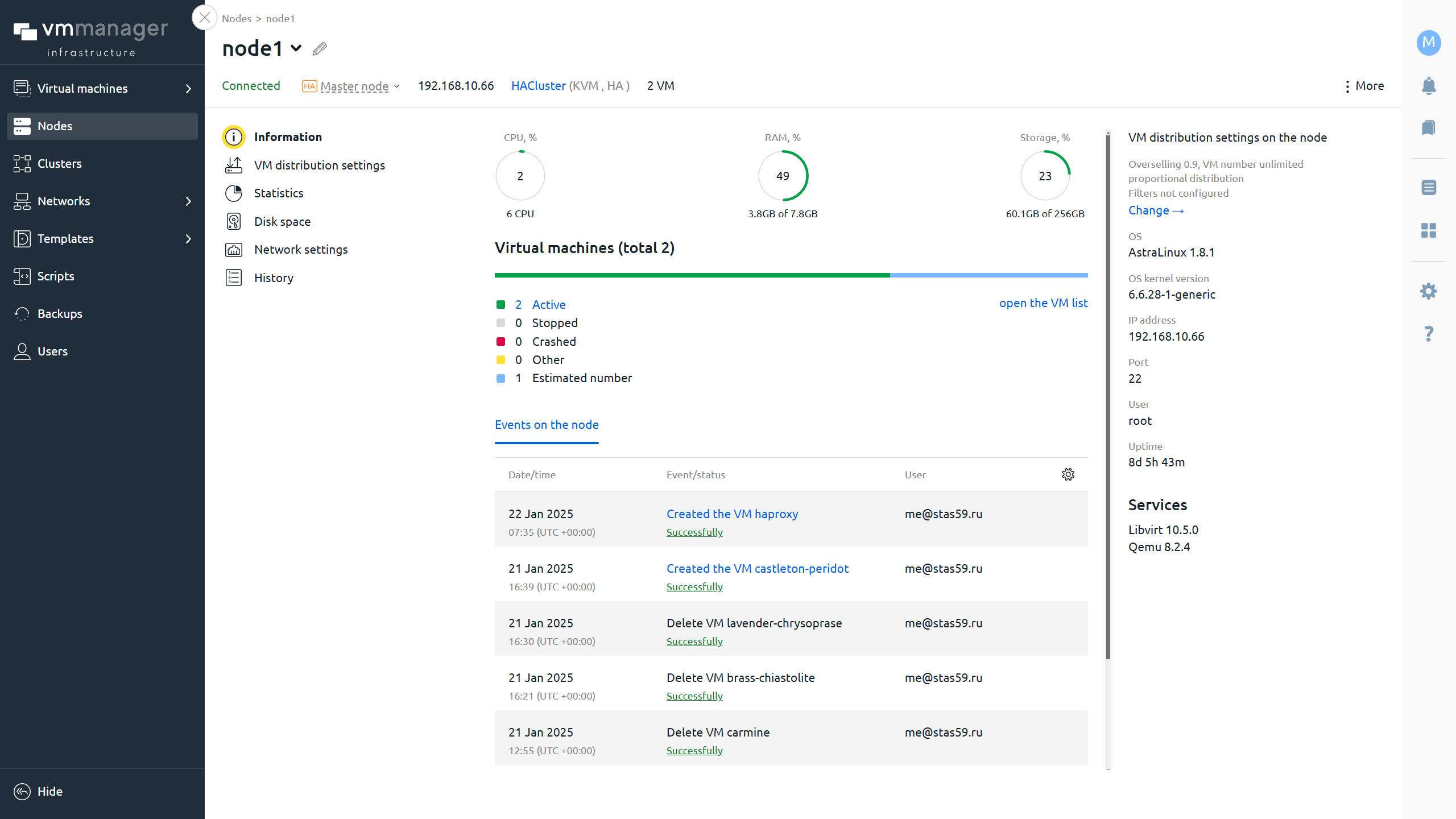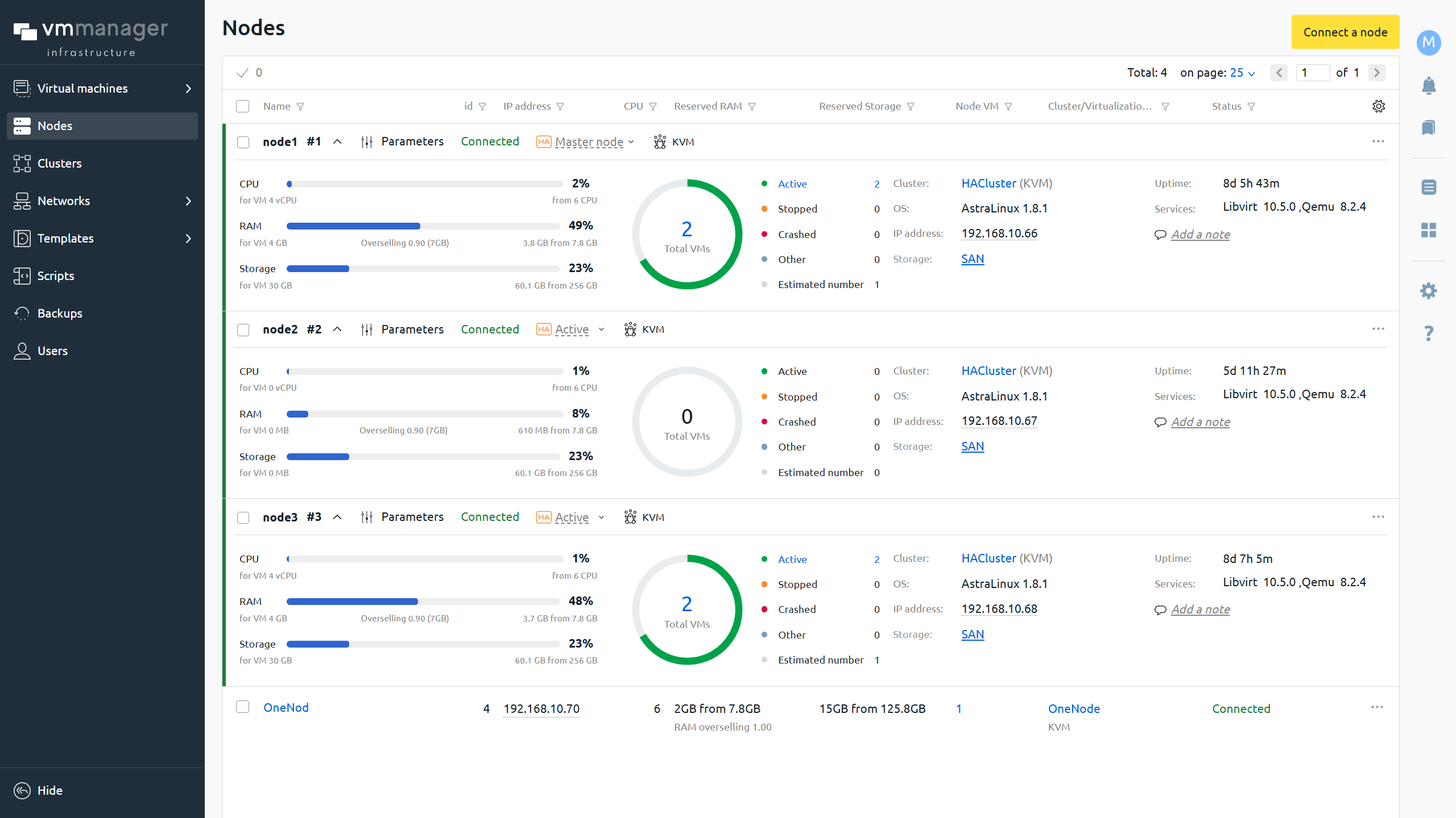 The product allows centralized management of the virtualization environment and efficient use of computing and network resources. The platform combines physical servers and network storage into a single virtualization cluster. SAN storage as well as Ceph storage are supported. A high level of reliability is achieved through a failover cluster, built-in backup, and microservice architecture of the platform.