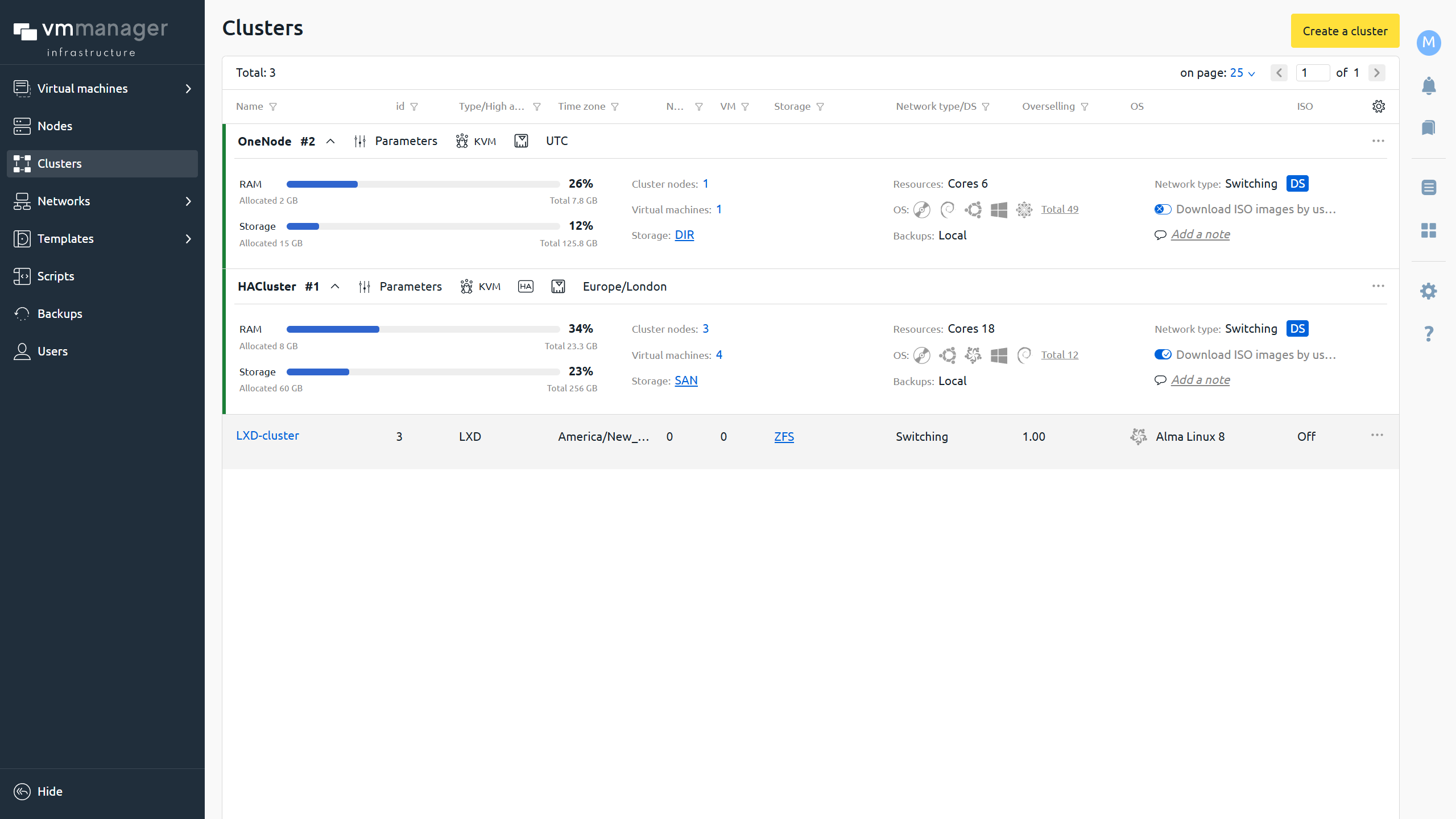 VMmanager allows you to seamlessly connect new hosts to the platform and add them to the cluster. The load balancing service will automatically distribute virtual machines across hosts in live migration mode. Show moreEfficient use of computing resources