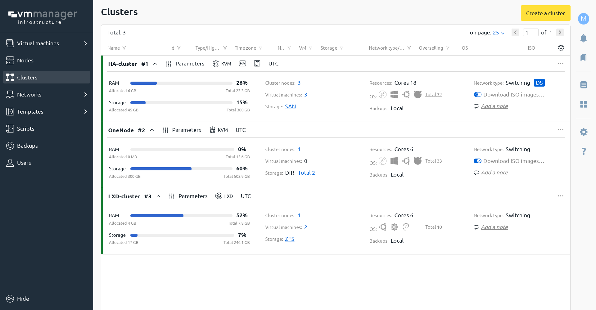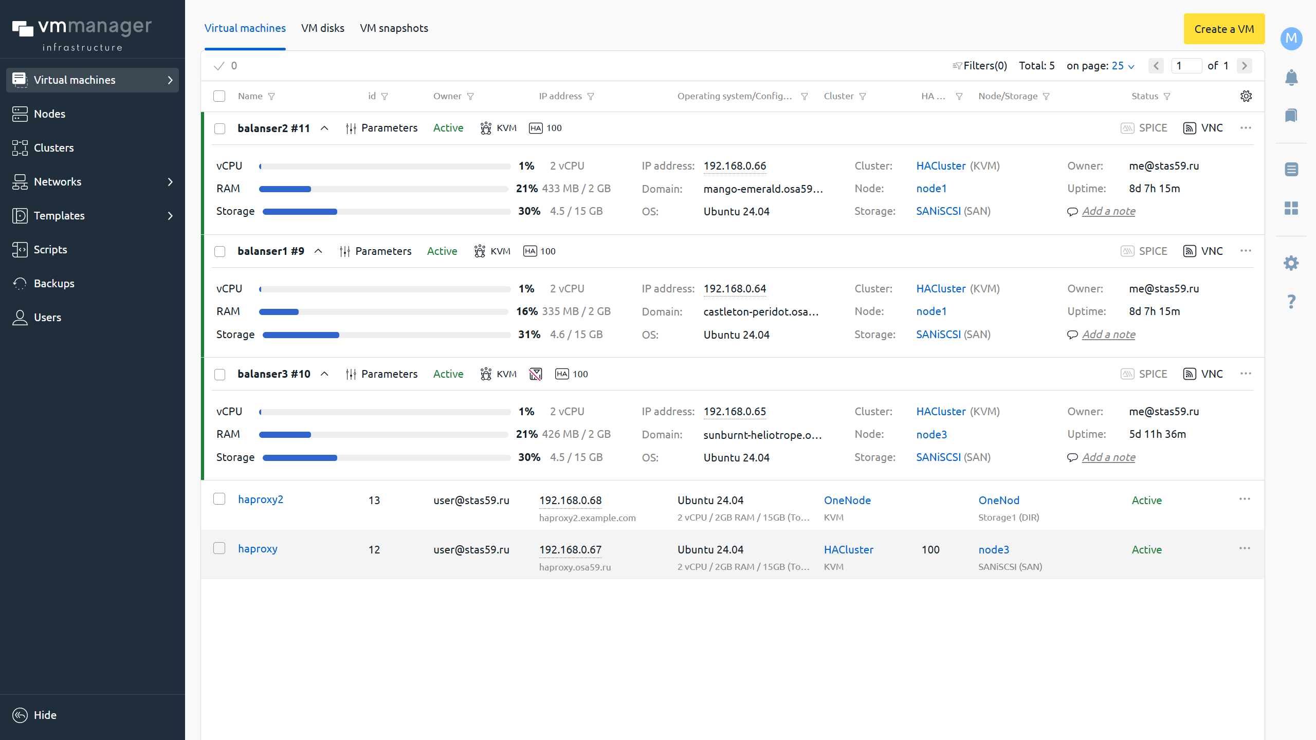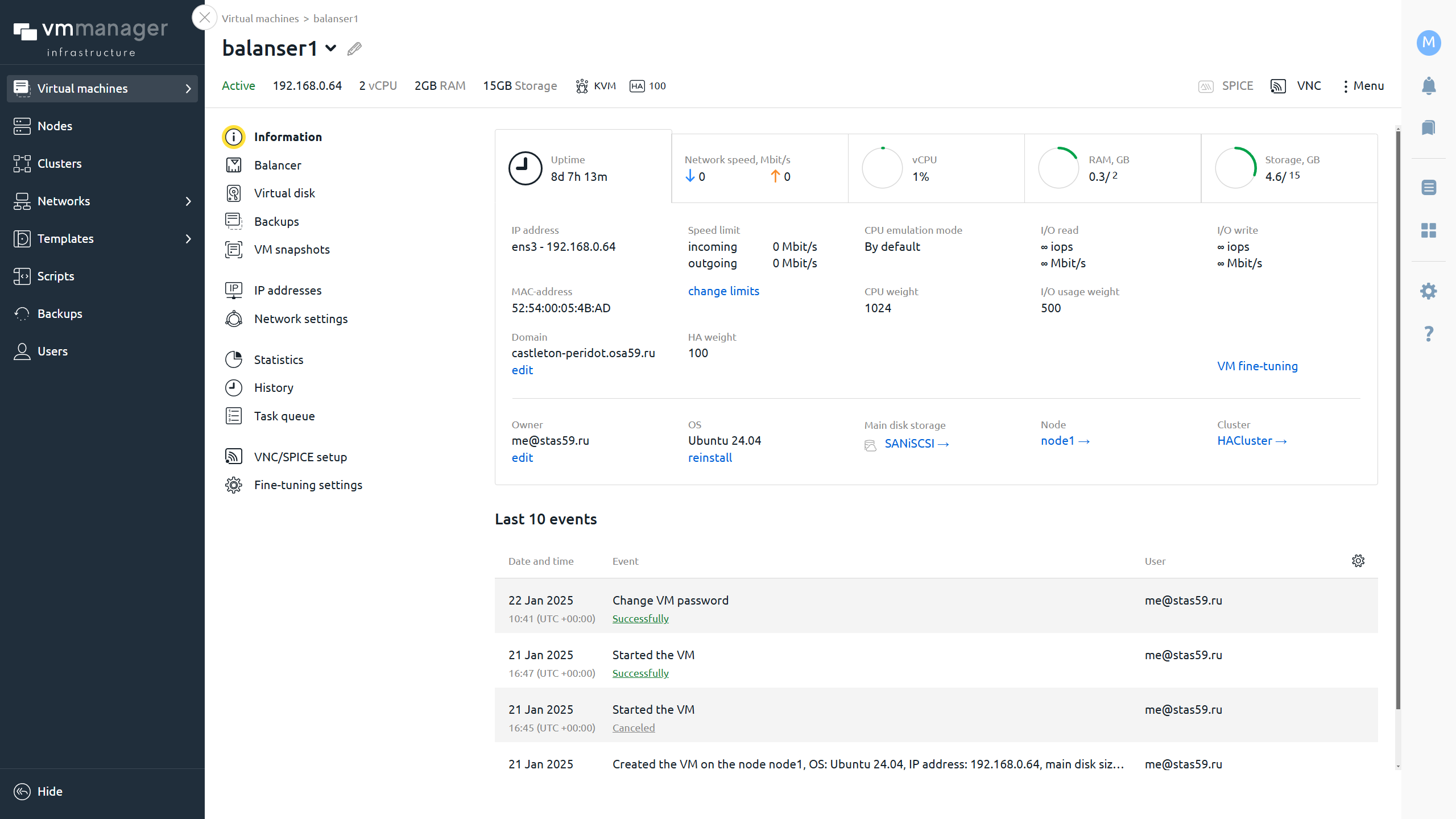 VMmanager is a platform for automating virtual infrastructure rental business. Suitable for managing hardware and container virtualization, isolating and abstracting virtual infrastructure from physical infrastructure, and providing cloud hosting services.