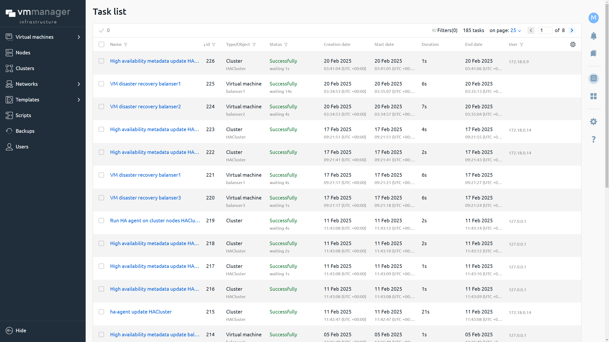 VMmanager provides a high level of fault tolerance for the virtualization environment.. In the event of a failure (due to node failure, data storage system failure, VM failure, or any other reason), the infrastructure will continue to operate or will be restored as soon as possible. Show morePlatform Customization and Modification with API